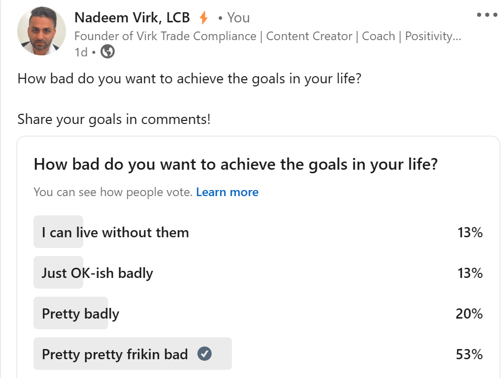I recently did a pole asking how badly the audience wanted to achieve their goals - Only close to 50% stated that they were “pretty pretty frikin bad”